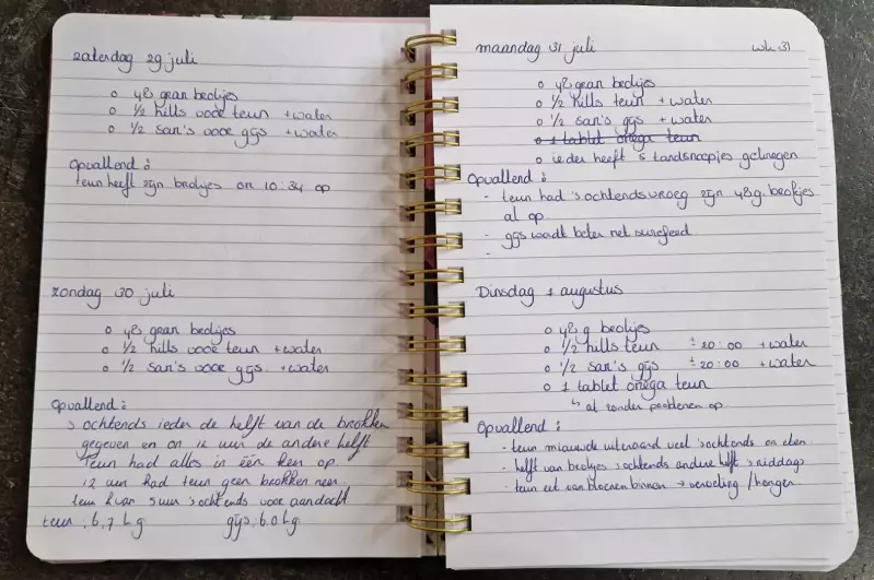 Mijn advies om alles op te schrijven. Zoals je op bovenstaande afbeelding ziet, houd ik het nu per dag bij. Soms zijn er dagen dat er niks bijzonders is gebeurd, andere dagen dan wel weer. Op deze manier kan je heel duidelijk patronen ontdekken. Dit helpt de dierenarts en een voedingsdeskundige.